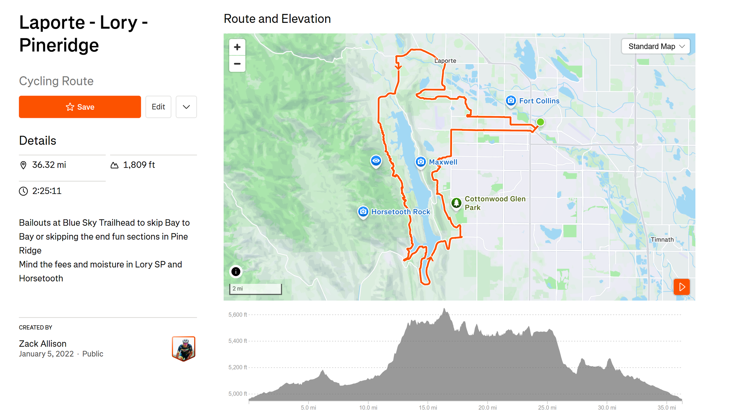 Notes: You need a park pass to enter Lory State Park. They offer daily bike passes online if you ride in or annual passes. Starting in 2023, vehicle registration included a state park pass option which would cover you riding in.